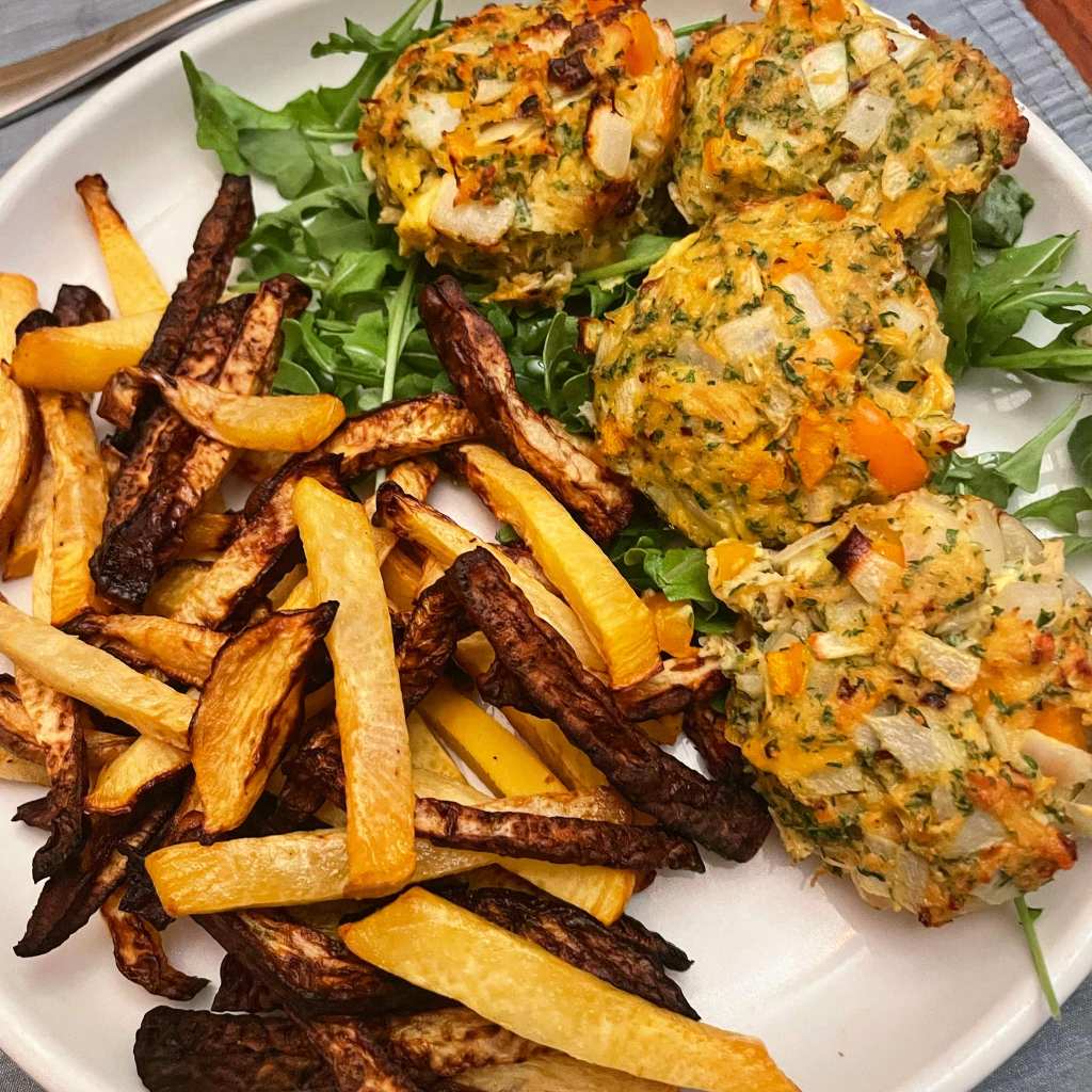 This meal is “Chicken Muffins with Rutabaga Fries” (331 Calories = 29g Protein, 40g Carbs, 8g Fat. The recipe for the Chicken Muffins (no flour or grains actually in the recipe–the name comes from the muffin pan you bake them in) is from The Protein Chef and is available on his website. It’s pretty much just canned chicken, eggs, and cheese with a few herbs and spices for flavor. A very attractive recipe for a low carb or keto diet person.