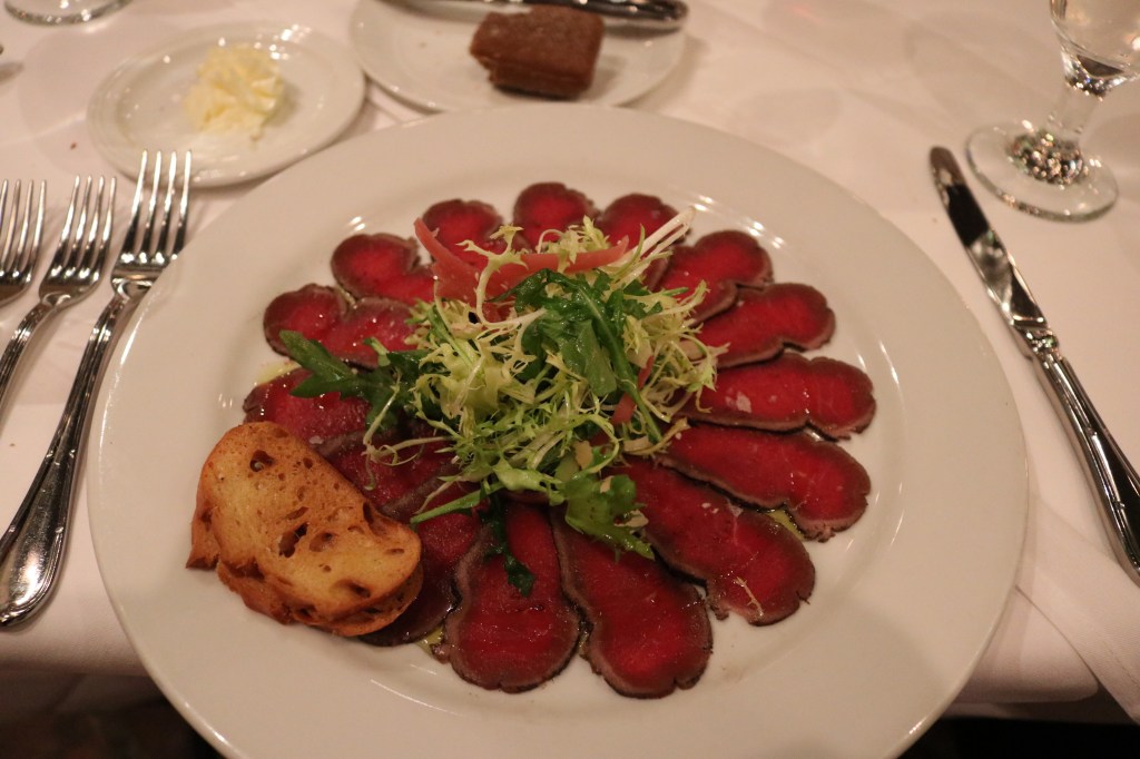 FIRST COURSE: VENISON CARPACCIO SMOKED AND ESPRESSO-CRUSTED CERVENA VENISON LOIN, FRISÉE, BABY ARUGULA, DRIED CHERRIES, ASIAGO CHEESE, PICKLED RED ONIONS, EXTRA VIRGIN OLIVE OIL This was my favorite course of the evening. I happen to love carpaccio, and this version was one of the best I have ever enjoyed. The meat was perfectly seasoned and sliced and the flavor of the cherries, cheese and pickled onions were a symphony in the mouth. Sweet, salty, acidic, and juxtaposed texture. All the components I strive for in a balanced dish.