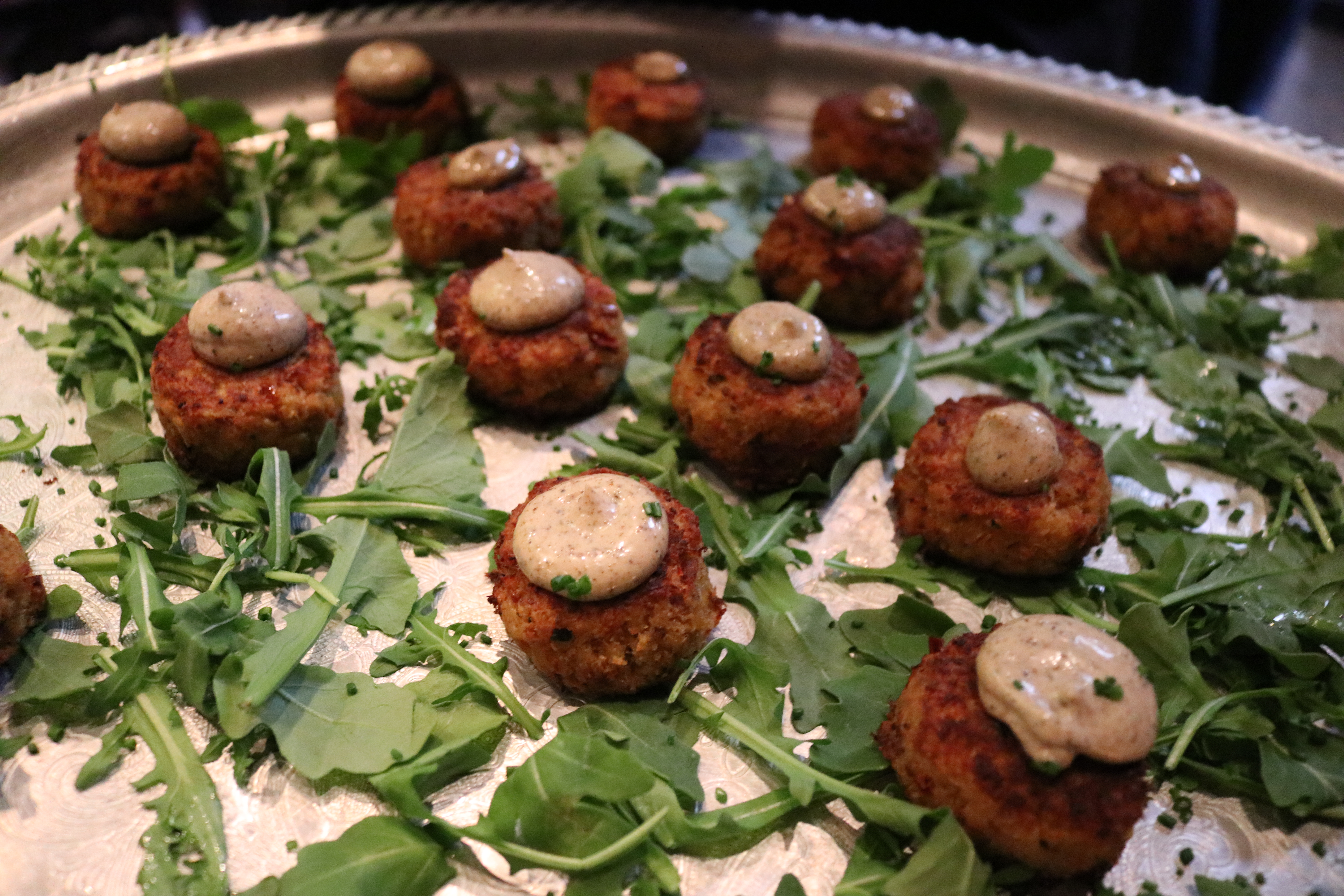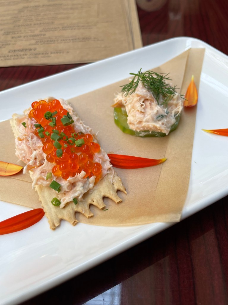 Next up, I tasted their smoked salmon tzatziki dip topped with salmon roe. This dip was creamy, flavorful and incredibly tasty across the texture of the cracker and the gentle pop of the roe. I sipped some of my Champagne and happily awaited more!