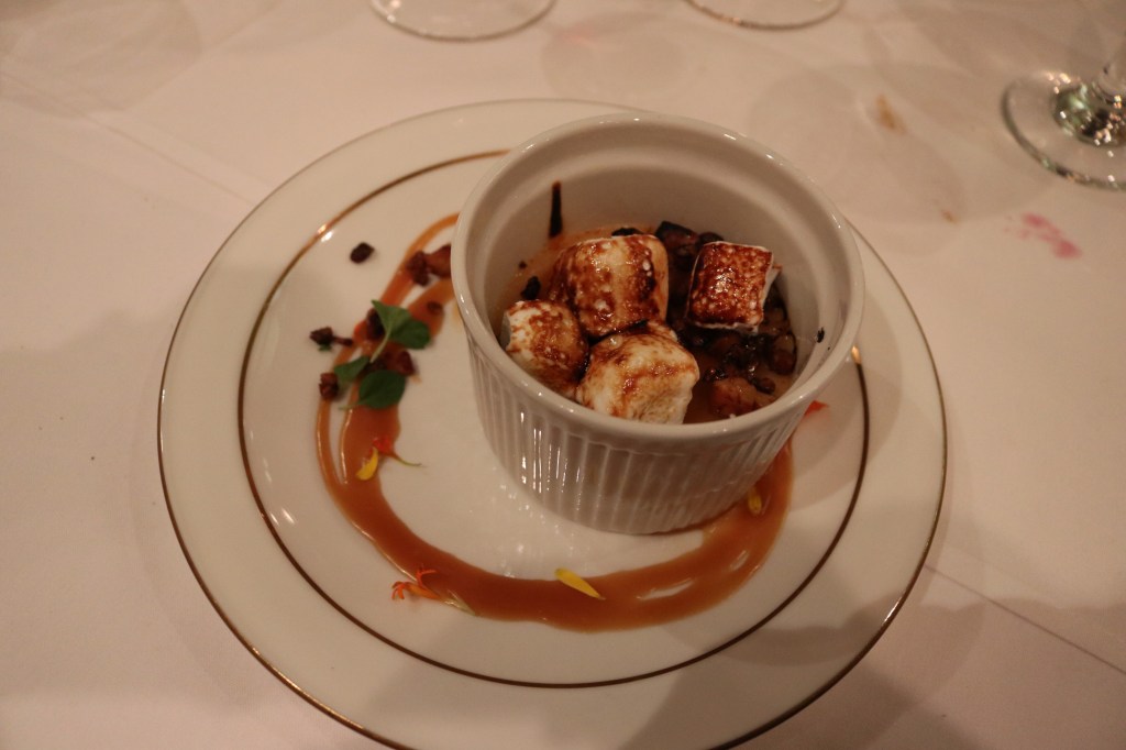 FIFTH COURSE: SWEET POTATO CRÈME BRÛLÉE HOUSE-MADE TOASTED MARSHMALLOW, SALTED CARAMEL SAUCE, SPICED PECANS What a beautiful rendition of a timeless dessert, with a wonderful autumn motif. The house-made marshmallows completely made the presentation both impressive and lavish.
