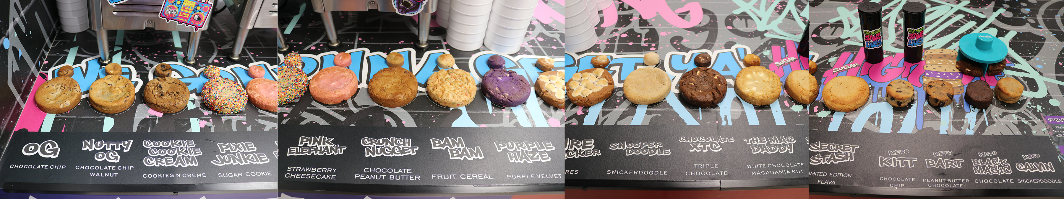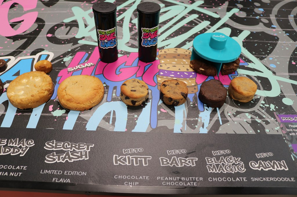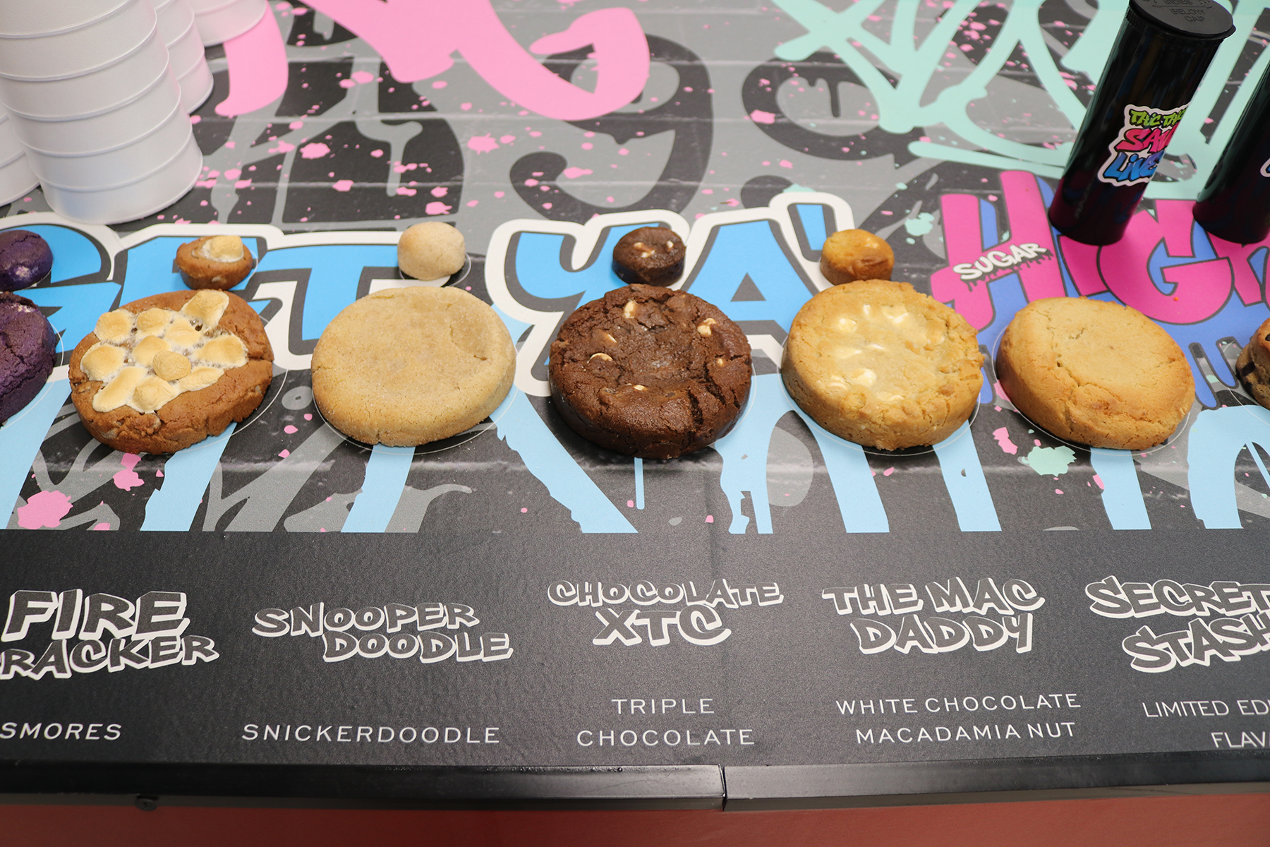 But let’s get to the cookies! Firecracker, Pixie Junkie, OG, Nutty OG, Purple Haze, Bam Bam, Cookie Cookie Cream, Chocolate XTC, Pink Elephant, Mac Daddy, Crunch Nugget, Snooperdoodle, Kitt (Keto), Bart (Keto), Black Magic (Keto), Calvin (Keto): All available daily plus and ONE “Secret Stash” that changes monthly).The cookies are large (4” wide by 1” tall), unless you opt for the two-bite sized “Poppers” that allow you to sample several flavors at a time.