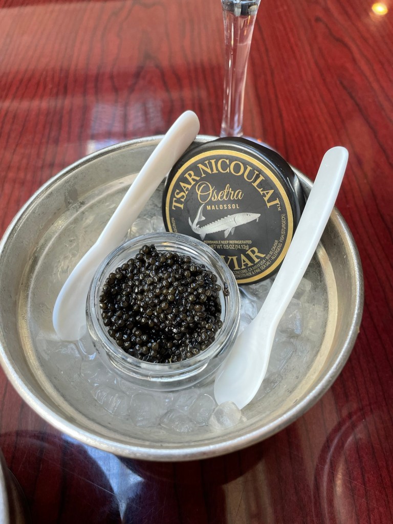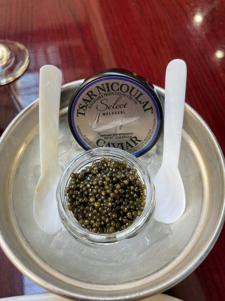 I selected a glass of Lanson Champagne to kick off my experience in style! Soon after, Tim brought me two different caviars to taste with a tiny little mother-of-pearl spoon. The first one was the “Classic” variety (from the California White Sturgeon raised on Wilton ranch), and the second was the “Baerii” (imported from their farm in Greece and from a species of sturgeon called Acipenser Baerii).