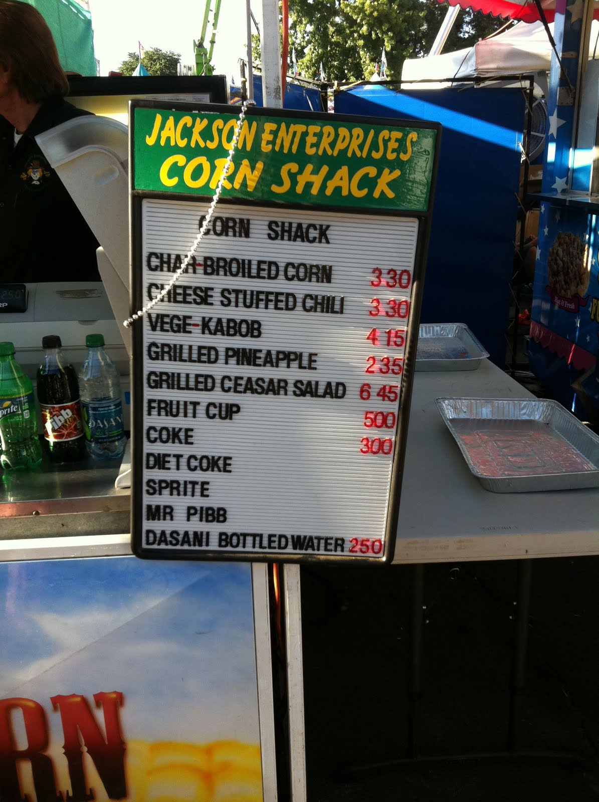 The same stand also sells vegetable kabobs, grilled pineapple (YUM) and fruit cups–awesome!! The stand is located near the kids rides on the way to the livestock area.