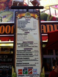 Here is a picture of her stand. Look for the big artichoke. Below are other choices at her stand. You can also get a steamed artichoke. Bring your own lemon and pepper or sea salt. I am not kidding. When you are dieting you plan ahead to avoid failure. There are even sandwiches at Jeanne’s (though I avoid anything with bread or processed grains), and those of course are better picks than anything deep fried.