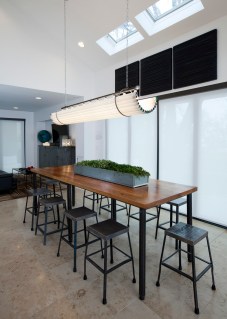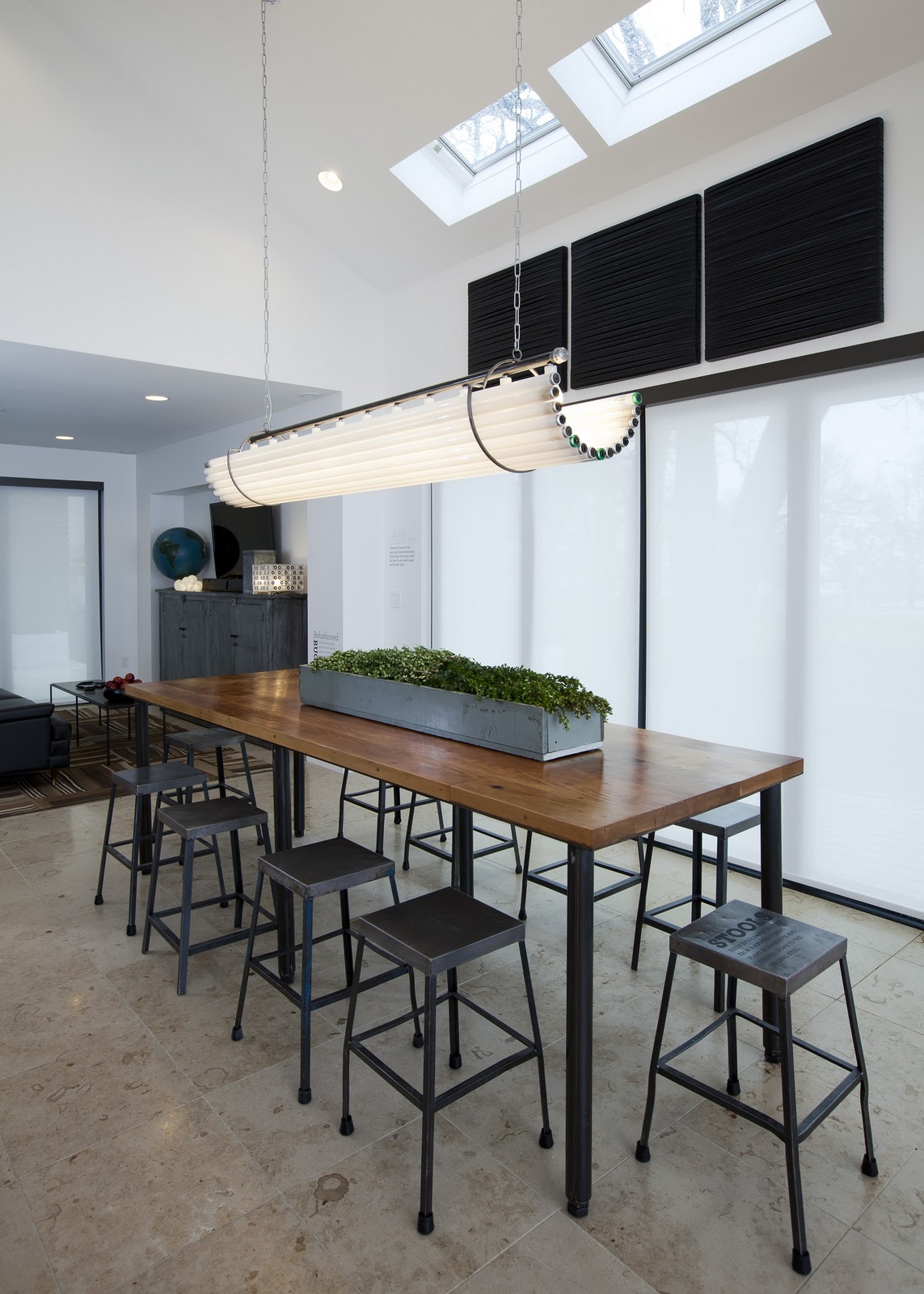 The dining room has a salvaged plank table, shade system with automated window treatments, dual pane windows, and a chandelier made from old CFL tubes.