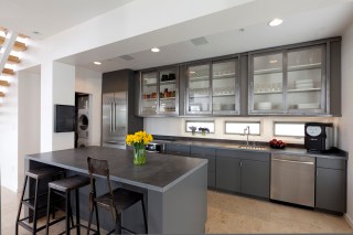 Let’s start with my favorite room! The kitchen! It features: Induction cooktops, built-in wall oven with speed convection to save cooking time, a tabletop composter that recycles its weight in waste every 10 days, and countertops made from mixed waste paper, recycled glass, and low carbon cement (over 50 percent post-consumer recycled content.)