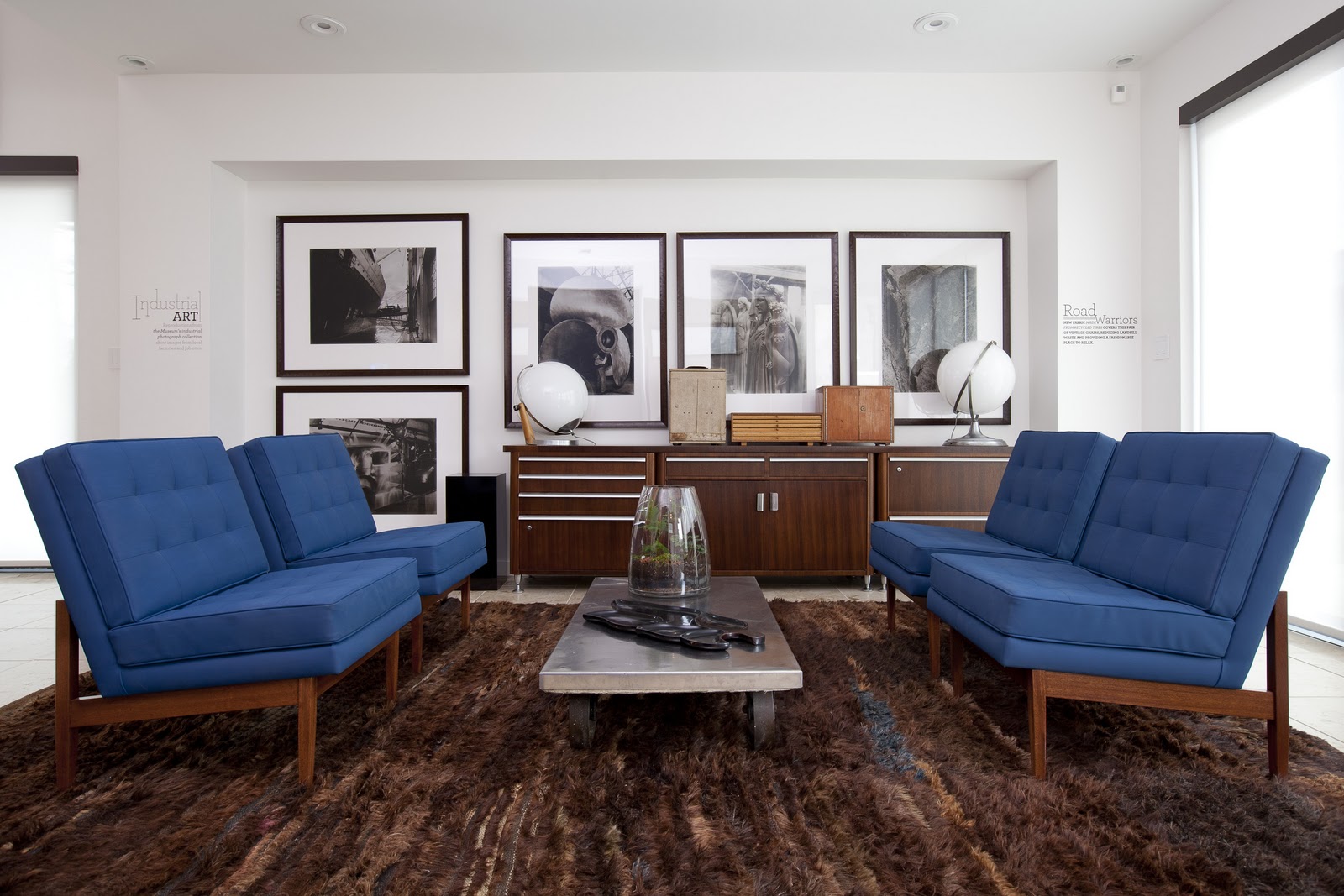 The living room features vintage chairs sourced locally and upholstered in recycled car tires, a rug made from reclaimed wool from vintage kilim rugs that have been unraveled and rewoven in the Turkish countryside, a walnut console that was found in an industrial firm and was sanded down to raw wood and refinished, and metal globe stands that have been repurposed into lamps.