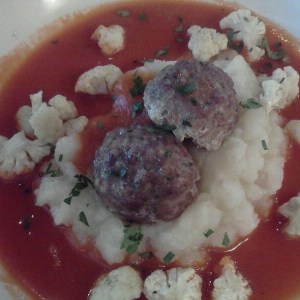 Berkshire pork meatballs, roasted cauliflower, celery root puree, smoked red pepper jus