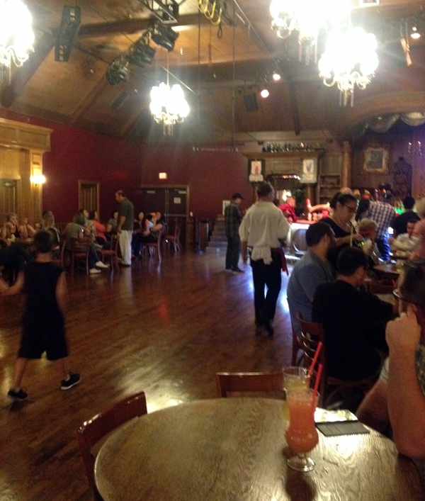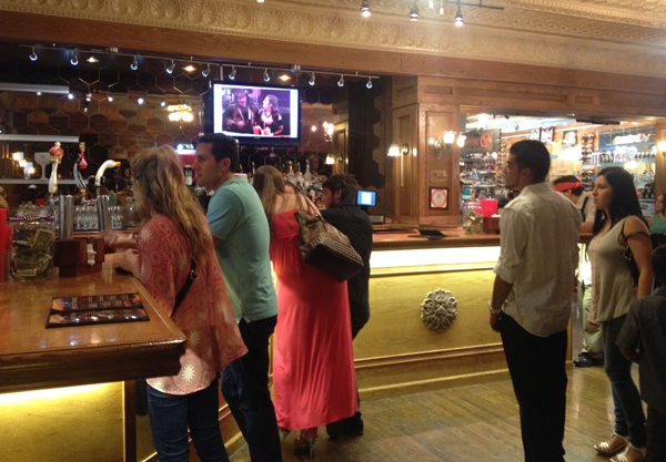 Drinks are available for purchase from two different bars at opposite ends of the room while patrons enjoy the appetizers and wait to be seated for the show.