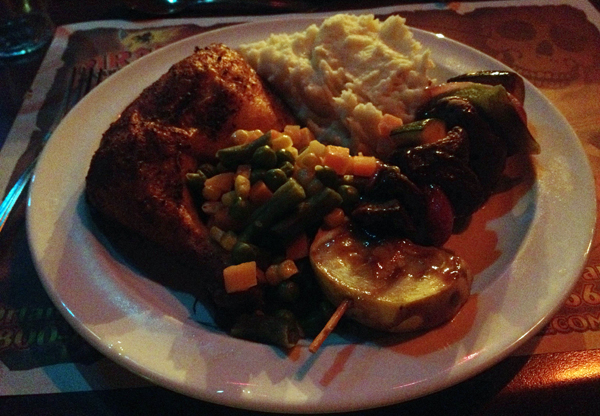 The night I attended the show, we were served a quarter chicken, vegetables, and a beef and vegetable kabob on a bed of mashed potatoes.