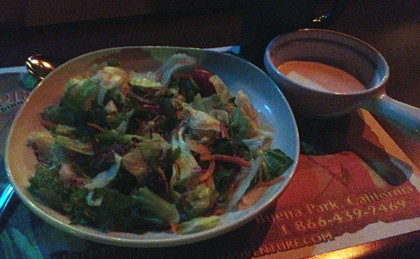 Upon seating, guests are greeted by their server for the evening, and the serving of food begins with a choice of vegetable soup or a salad. (You can get dressing on the side if you wish, as I did).