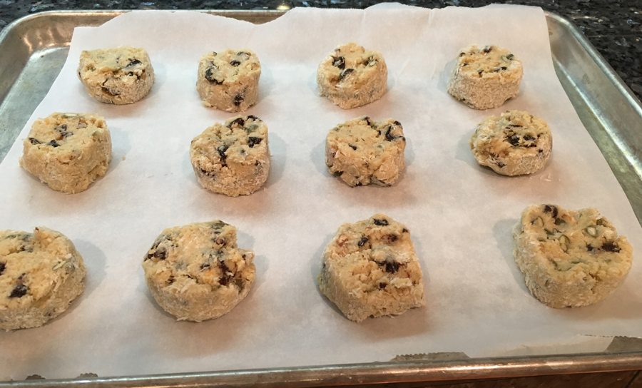 Preheat oven to 325°F. Line 2 cookie sheets with parchment paper. Remove the dough logs from the refrigerator, and remove the plastic wrap. Slice the dough into coin shapes and place on the cookie sheets. There should be enough for 12 cookies in each dough log.