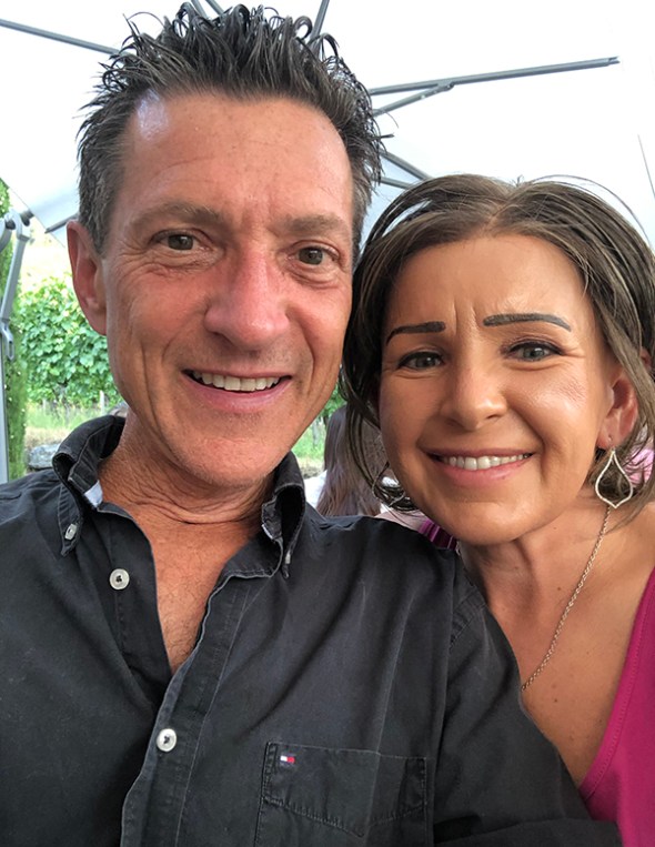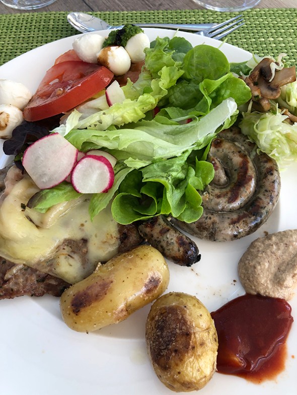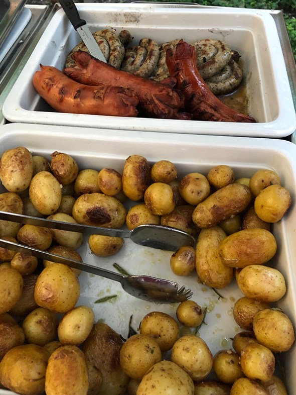 It was surreal to spend Independence Day at such a magical place. Guests of the event along with my husband Andy and myself were given a welcome toast and seated at tables outside within feet of the rosebush-lined vineyard. We were then dismissed table by table to fill our plate in the buffet line. There were many different items from which to choose: sausages, hamburgers with speck and cheese, steak, fish and shrimp, sauces to dress them, multiple salads, roasted potatoes, breads, and rolls.