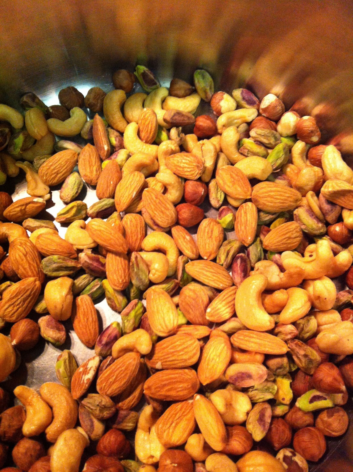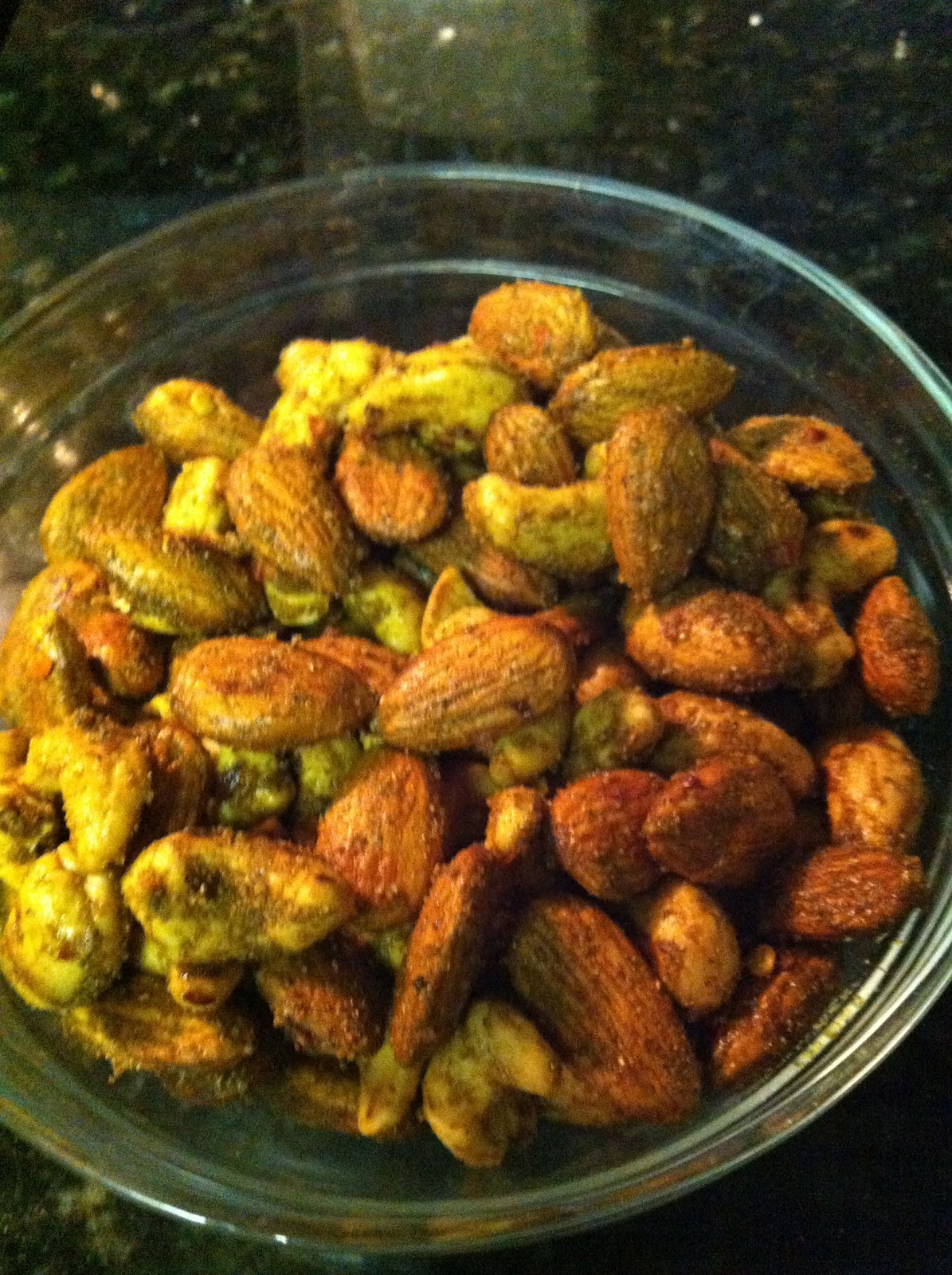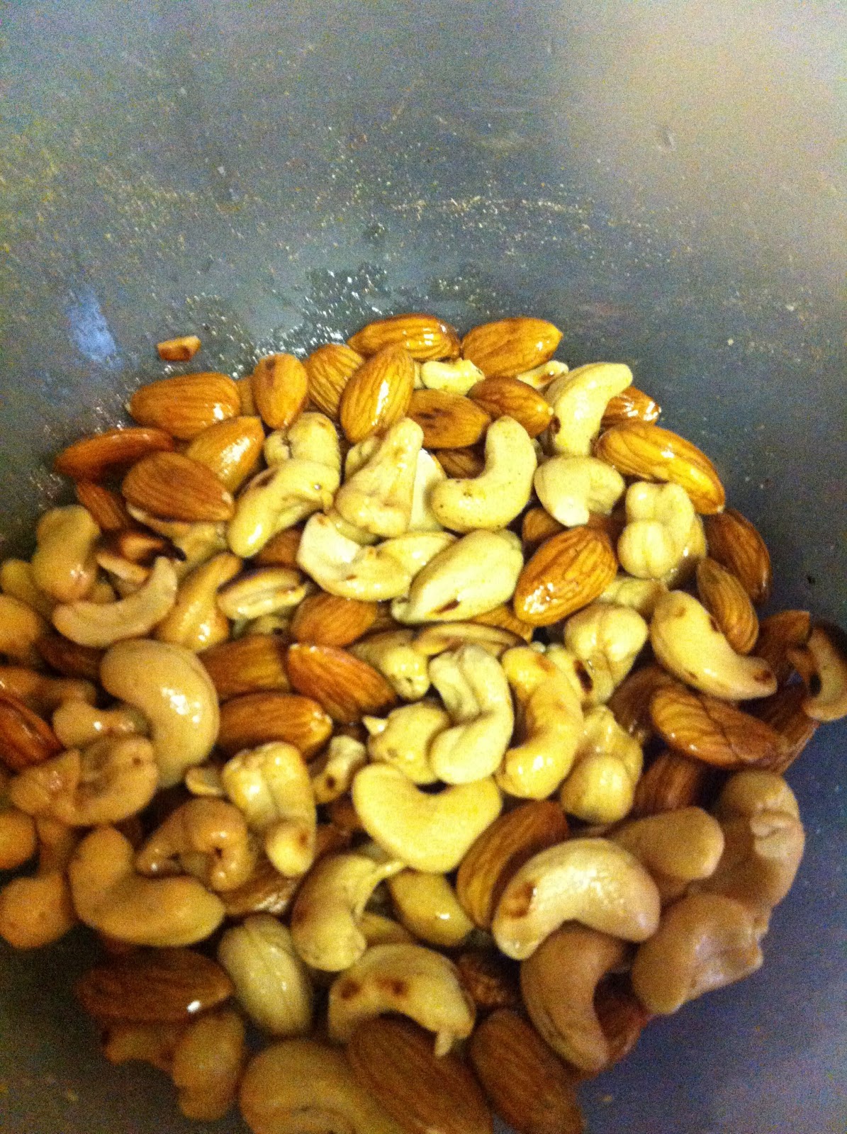 Drizzle 1 Tbs coconut oil over the toasted nuts and then sprinkle the curry powder mixture over it. Stir with a spoon to coat the nuts completely.