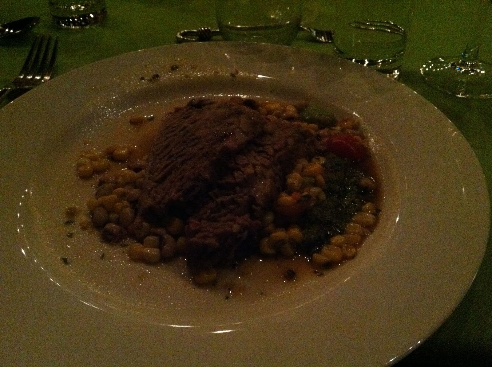 The third course, was quite possibly my favorite and sadly I don’t have a better picture of it. It was a slow cooked Beef Brisket with shell beans, corn, and Del Rio Farms herb salsa prepared by Scott Rose. For those of you in Paleo land, I didn’t eat the corn, but did have a few delicious beans. 😉 This course was paired with a wine from Bogle.