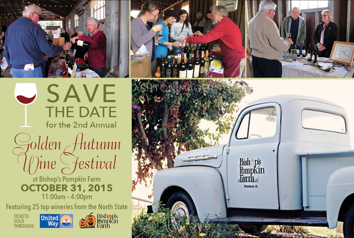 I just found out about another fun food and wine event, this time featuring wine regions north of I-80. It’s called the 2nd Annual Golden Wine Festival and it’s going to happen on October 31st, 2015 from 11:00am-4:00pm at Bishop’s Pumpkin Farm in Wheatland. (Bishop’s Pumpkin Farm is located at 1415 Pumpkin Lane in Wheatland, CA).