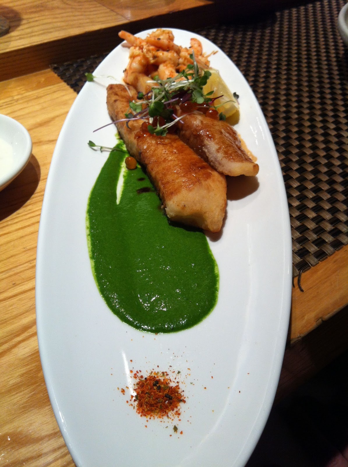 The BF ordered this for his main dish. It was the sautéed tilapia, with 6 ounces of butter-poached shrimp, ikura, english peas, spinach puree, meyer lemon soy. Yoshi’s really does everything perfectly, especially the plating. Really beautiful.