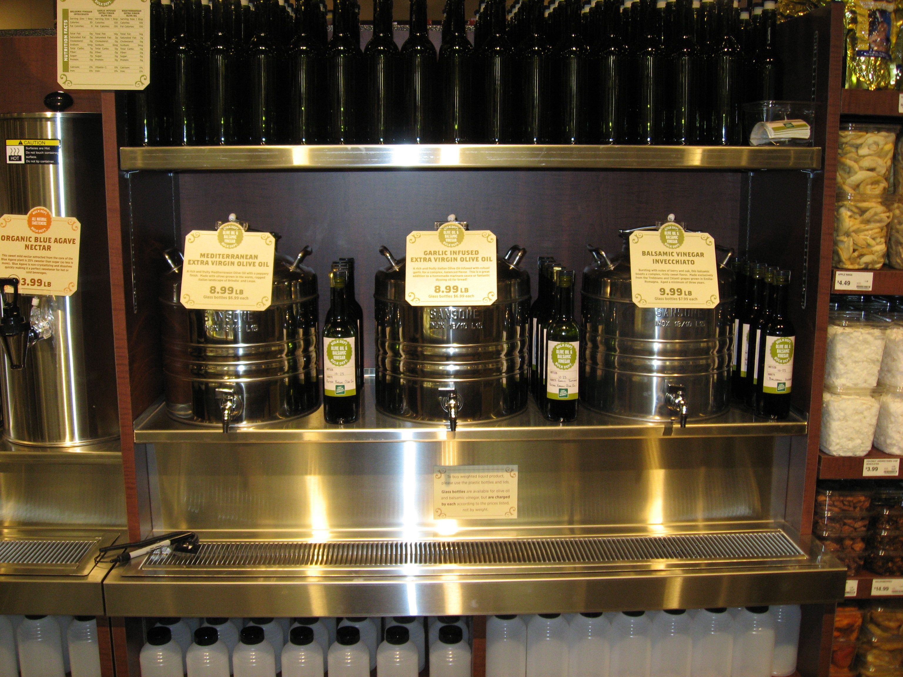 - An olive oil station will bottles for refill. They also have a balsamic vinegar station, as well as freshly ground peanut and almond butters.