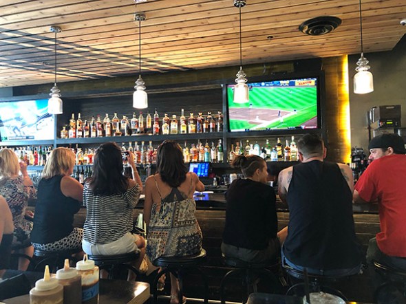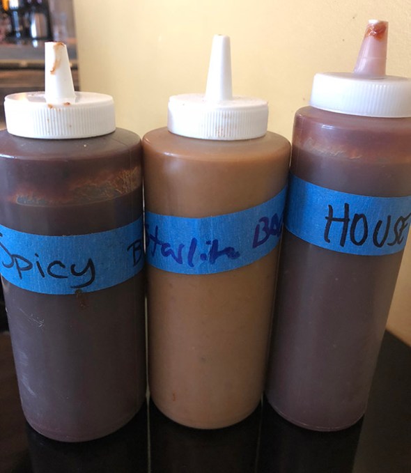 I sat at a small table against the wall, facing an already lively bar scene and two televisions broadcasting different sporting events–one of them a Diamondbacks game. Across from me on the table was a selection of house-made sauces. I was eager to try them all, but stopped short of squirting the bottles directly into my mouth. First, I selected a beverage to nurse while I contemplated what to eat.