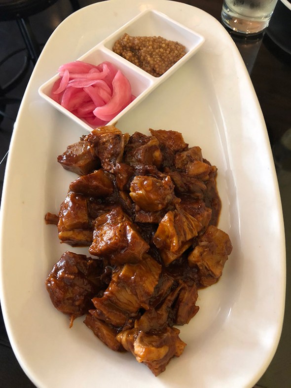 For the main course, I selected the 1/2 plate of Chopped Pork. It comes with pickled onions and mustard on the side. I ordered a glass of rosé to pair with the pork. I could have gone a little heavier on the wine, especially because of the sauce on the meat, but in the heat of summer, I am hardwired to order bubbles or rose, no matter what the protein or the “traditional” pairing.