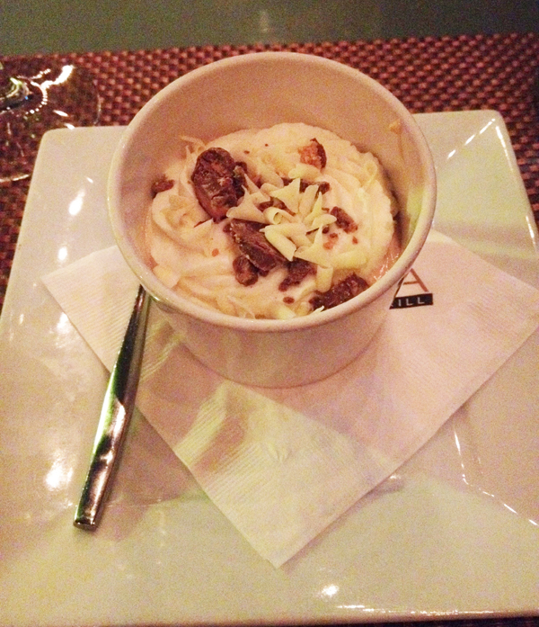 Some of the guests around me were very excited about the mushroom latte, because they had enjoyed it many times before at Matteo’s (the brick and mortar restaurant owned by Supper Club Catering). The “soup” was indeed everything they described, earthy and creamy, and looked just like a small cup of cappuccino. I gave the bread on my sandwich to Andy, but not before I scraped the goodness inside. Pesto is one of the most incredible things!