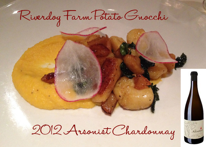 The second course presented to us was a Riverdog Farm Potato Gnocchi served with fall squash, Apple Hill apples, lacinato kale and cream. It was served with the 2012 ‘Arsonist’ Chardonnay, Dunnigan Hills. The upfront nose on the wine revealed aromas of toasty oak, caramel apple and crème brûlée. It was an automatic match with the plump buttery gnocchi and apples in the cream sauce. Gnocchi is the only pasta I even missed post-Paleo, so this was like eating dessert for me! Also, lots of wonderful comments from my table mates––they also loved the squash and apples in the dish. It was the essence of fall! Great pairing, Chef Carlini! 🙂