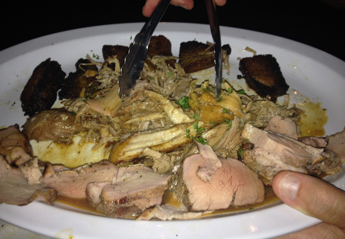 Crispy Pork Belly, Smoked Tenderloin and Braised Shoulder Served with Colossal Runner Bean, Tomato, Fennel and grilled Fig Salad