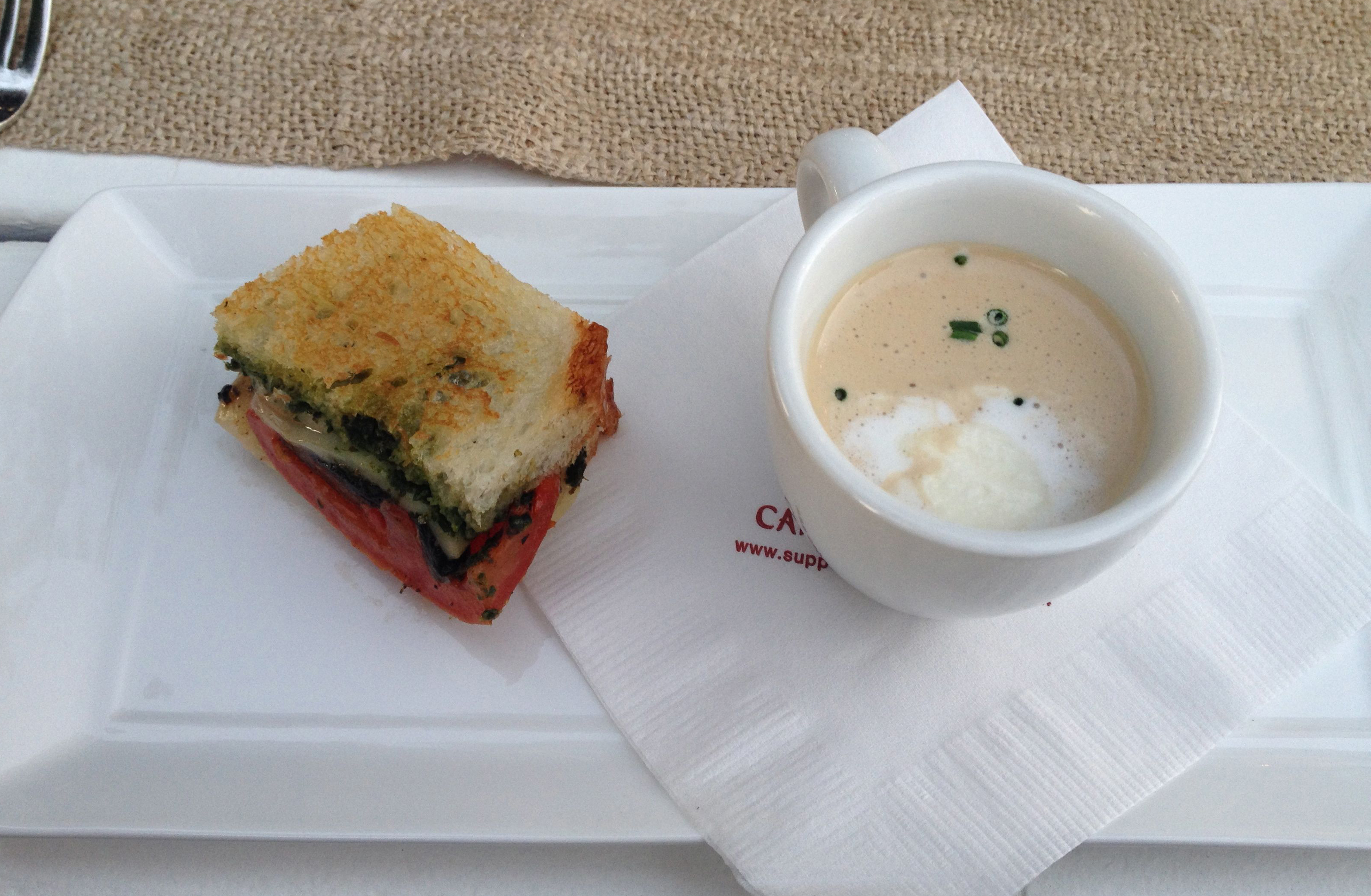Wild Mushroom Latte in Demitasse with White Truffle Crema Shacking up together with Grown Up Grilled Cheese with Smoked Portobello, Gruyere, Oven Dried Tomato, and Arugula Pesto