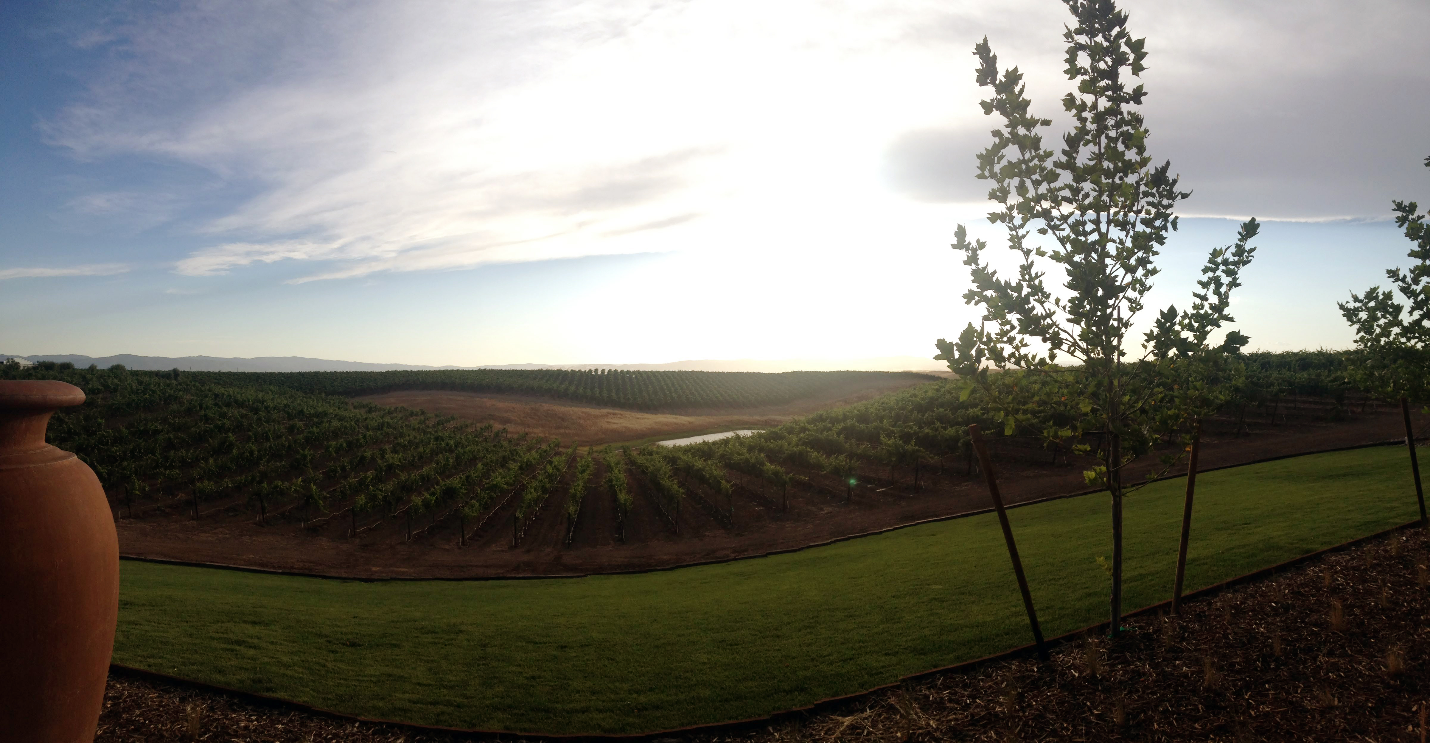 It was also great to finally see the tasting room (which has been open since October of last year). It’s an oblong shaped space with the tasting bar at one end and a large dining/board meeting table at the other. There is an impressively large chandelier that hangs above an island of items for sale. Out the back doors leads to a patio with a drop-dead stunning view of the vineyard. Nice digs.