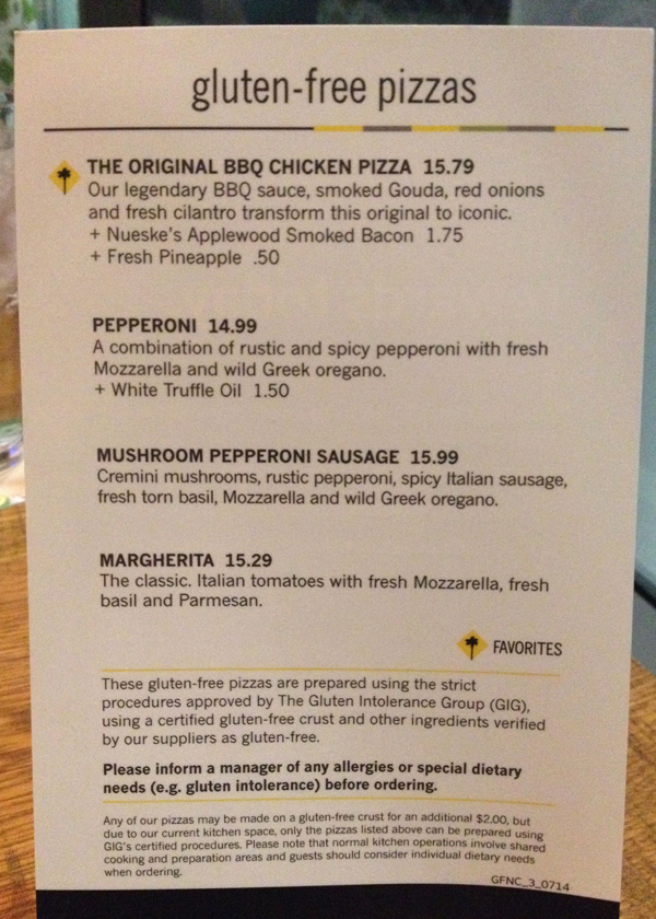 Here’s are the pizzas that now come gluten free (including the CPK classic BBQ Chicken pizza: