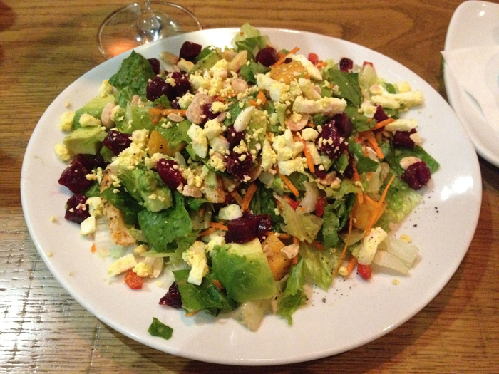 chopped egg, beets, fresh basil and Gorgonzola with housemade bleu cheese dressing (on the side). OK, so I love Cobb Salad and pretty much order it whenever possible. I have said in the past that a Cobb might possibly be my choice for last meal on Earth. I know that might sound a little odd, but the combination of chicken, avocado, bacon, and blue cheese crumbles is pretty much my favorite thing. New pizza variety perhaps? 😉