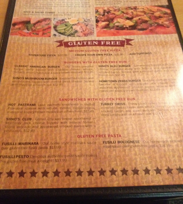 But back to that great gluten free menu. I am not sure of the inspiration for that, but I was pleased to see a restaurant with a whole section of their menu devoted to gluten free items. Patrons can order pizza, burgers and pasta sans gluten.