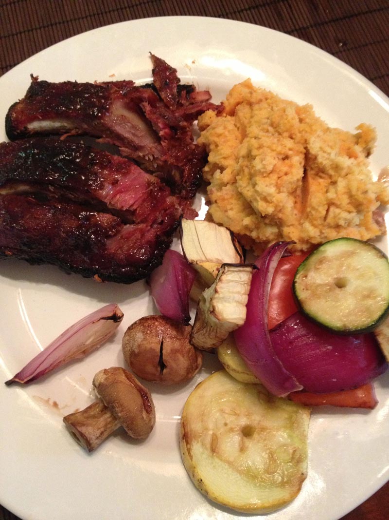 We put together a little dinner around them with mashed sweet potato & cauliflower, as well as grilled vegetables: