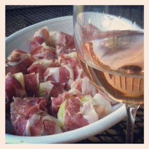 We also dined on pork and blueberry meatballs (recipe to come), a huge salad, and prosciutto-wrapped melon. Dessert was some 80% chocolate and bacon-wrapped dates. RB and I really love to entertain and cook for others!