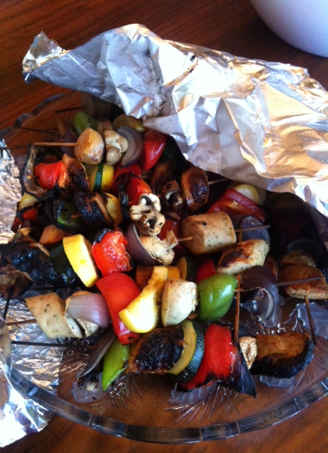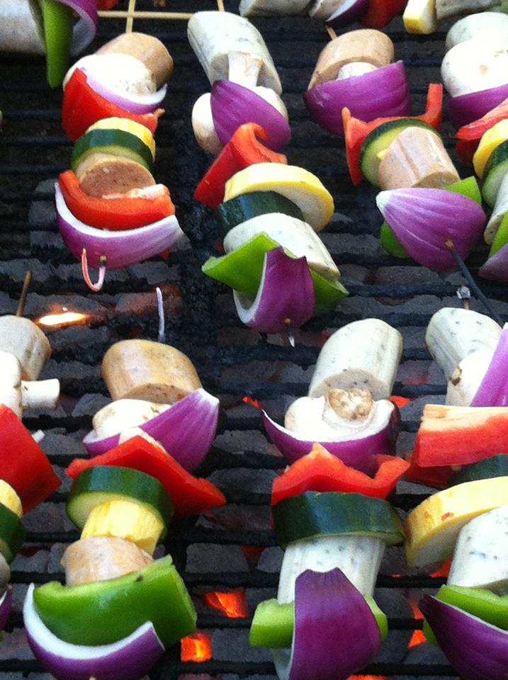 So to help out on the food preparation, and because I sensed it was a good opportunity to try the different flavor options, I skewered up the sausages with a colorful bunch of vegetables, and we threw them on the grill.