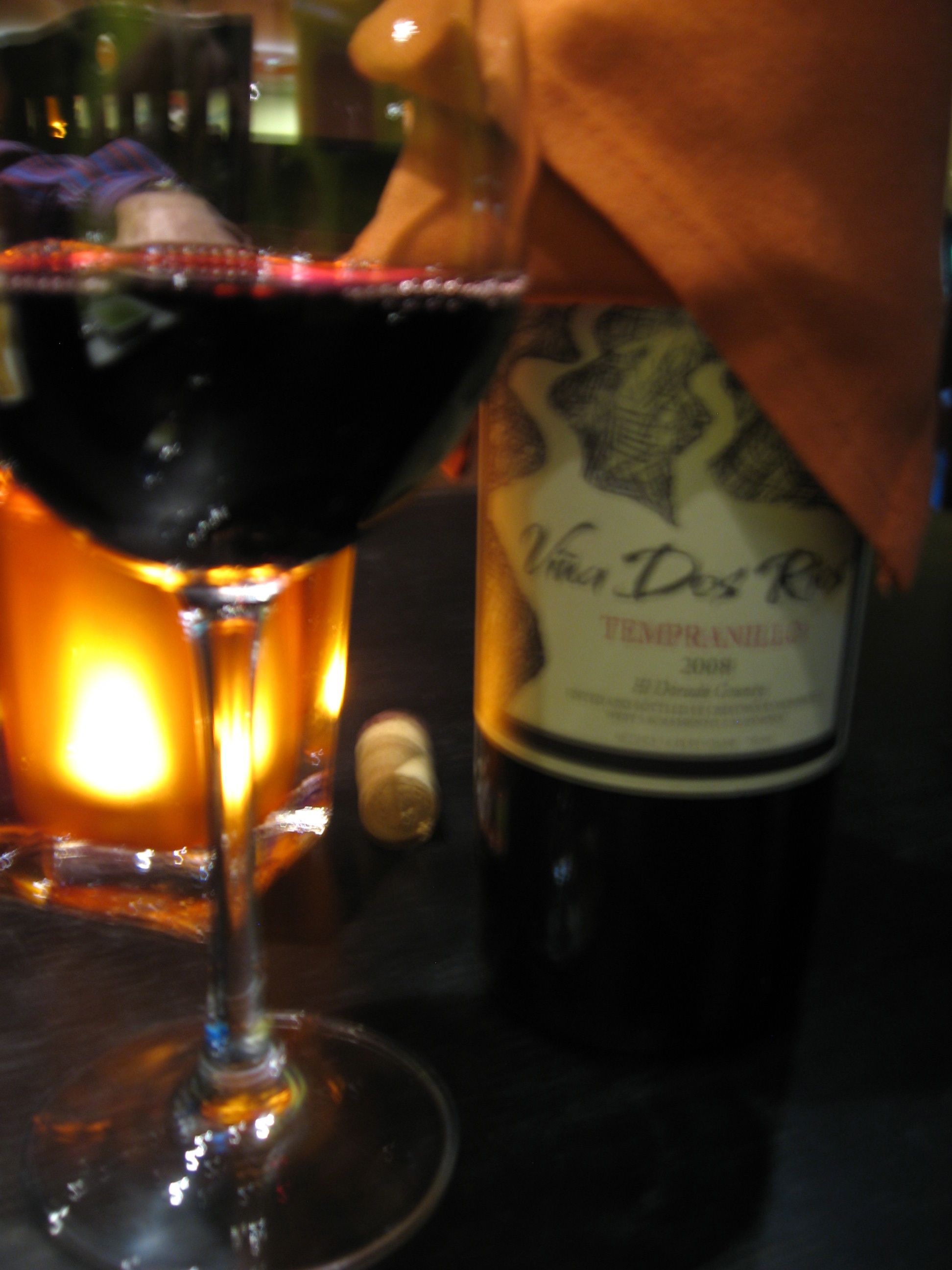 Andy threw out a few wines and I immediately went for a 2008 Tempranillo made by Vina dos Rios, (Crestwood Monarch Winery) in El Dorado County.