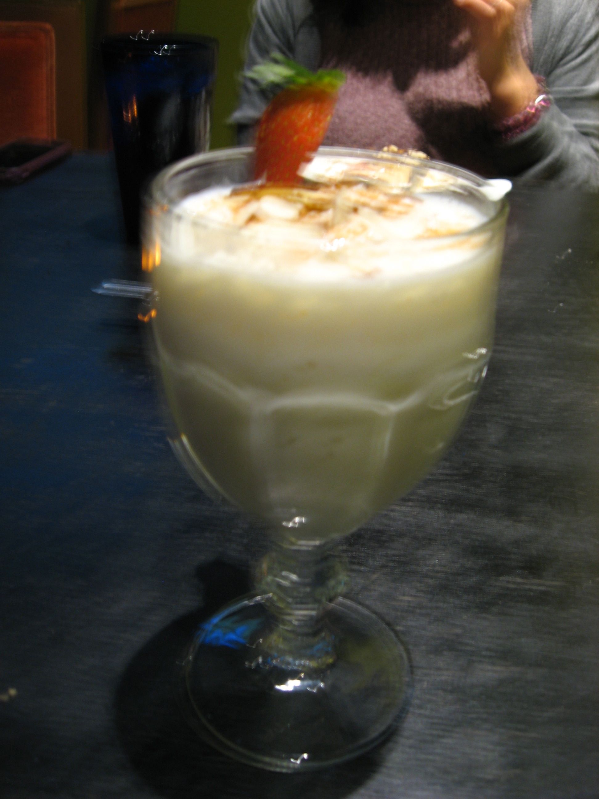 Andy ordered the Arroz con Leche. It’s rice that is simmered in sweetened milk and flavored with cinnamon, and topped with raisins. That’s me in the background waiting to have a taste. Once I did, I loved the cinnamon and the texture of the rice. And then Andy stole it back and polished it off. Whatever!! 😉