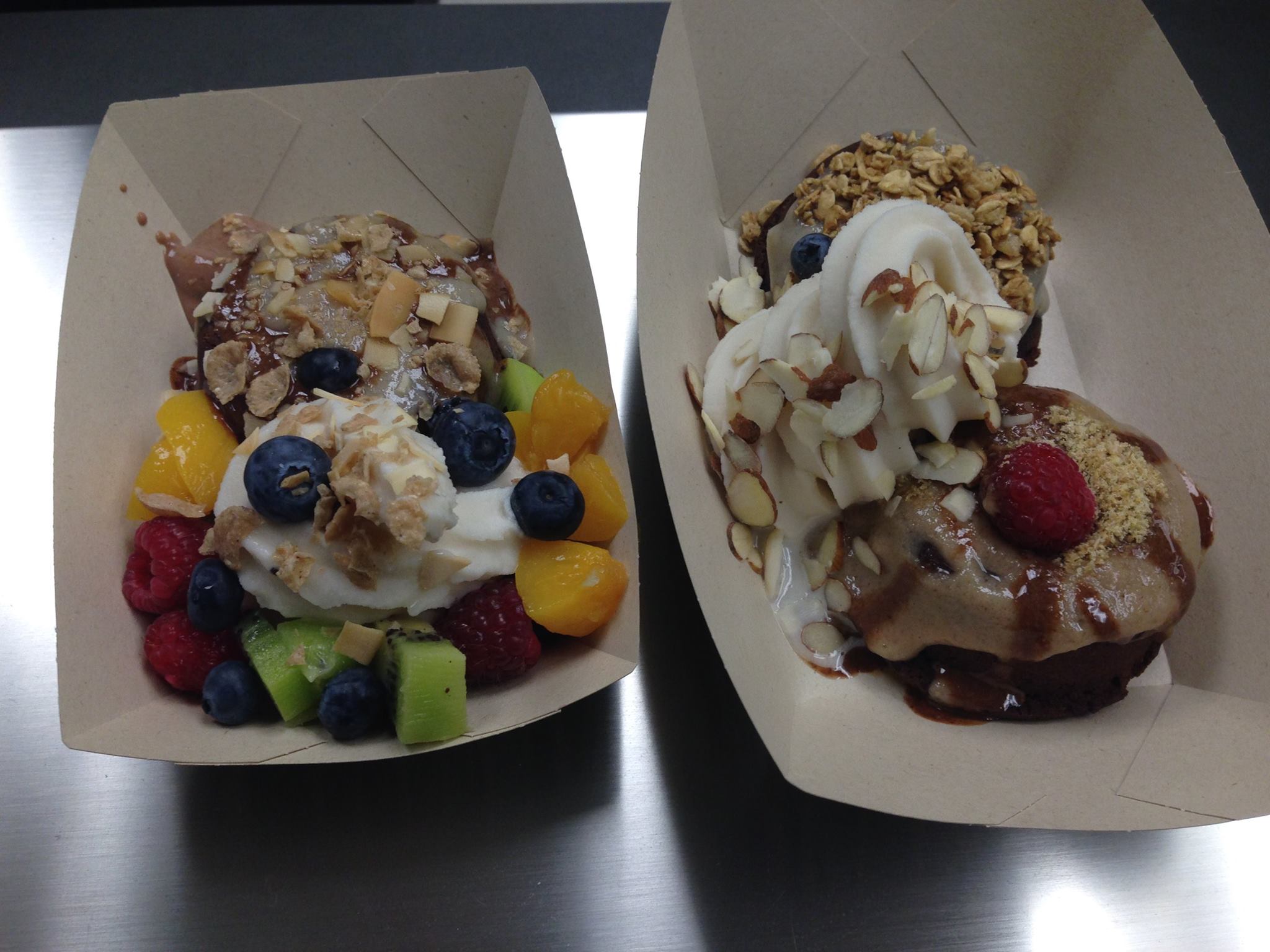 Last Friday, I stopped by a new place in Roseville called Dr. Bob’s Donuts and DoYos. They’ve been open about 3 weeks now and are the first to serve steamed gluten free and vegan donuts in the area. At Dr. Bob’s, customers are able to fully customize their donuts with different glazes, syrups, puddings, and dozens of toppings. Taking their creations a step further, they can add up to two different kinds of dairy free frozen yogurt to make a DoYo. Donuts AND frozen yogurt? And it’s healthy? Where do I sign up? 🙂