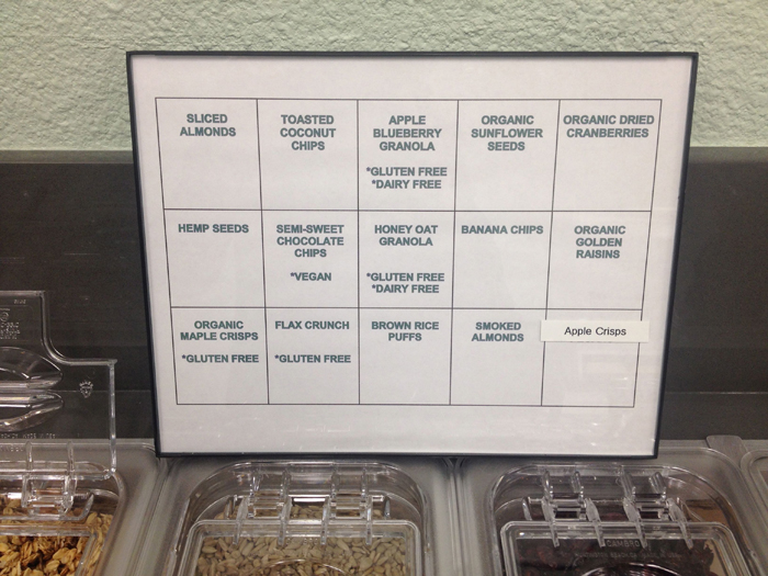 Next and finally there is the dry bar of toppings. This station gives a little bit of crunch and texture to your creation. There are also a few different agave nectars and honey if you need a little more sweetness.
