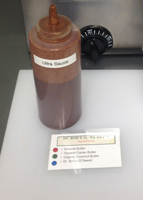 After you select a donut, you can top it with any of the house made glazes and sauces. This one is the “Ultra Sauce” made with almond butter, organic cacao butter, organic coconut butter, and Dr. Bob’s G* Sweet (a sweetener made with a blend of cane sugar, coconut palm sugar, lo han guo, coconut water powder, and stevia) that is 6 times sweeter than table sugar–meaning you can use less of it and it still tastes very sweet. 🙂