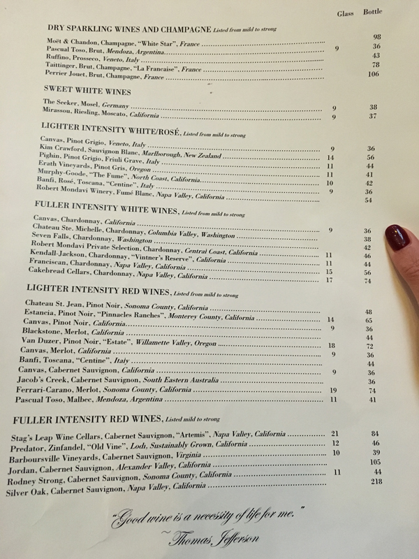 Since I was informed what my dinner would be as I sat down, I ordered a glass of wine to pair with it. The Stag’s Leap Artemis Cabernet Sauvignon.
