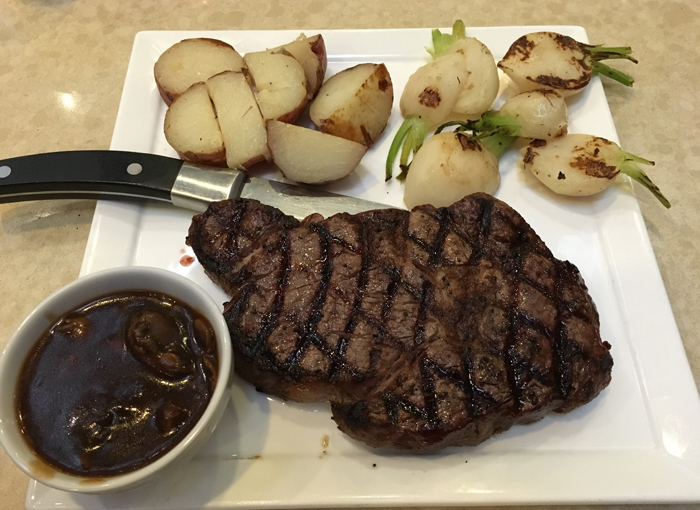 Then my meal arrived, served by the Chef himself. It was a Rib-Eye steak, cooked medium rare, with turnips and potatoes. There was also a decadent mushroom sauce (I ordered on the side). Let’s just call it mushroom ketchup because I used it as a condiment for the perfectly cooked bites of steak and tender turnips and potatoes.