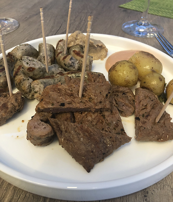 It was surreal to spend Independence Day at such a magical place. Guests of the event along with my husband Andy and myself were given a welcome toast and seated at tables outside within feet of the rosebush-lined vineyard. We were then dismissed table by table to fill our plate in the buffet line. There were many different items from which to choose: sausages, hamburgers with speck and cheese, steak, fish and shrimp, sauces to dress them, multiple salads, roasted potatoes, breads, and rolls.