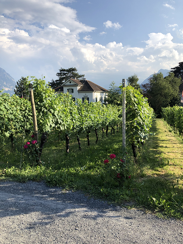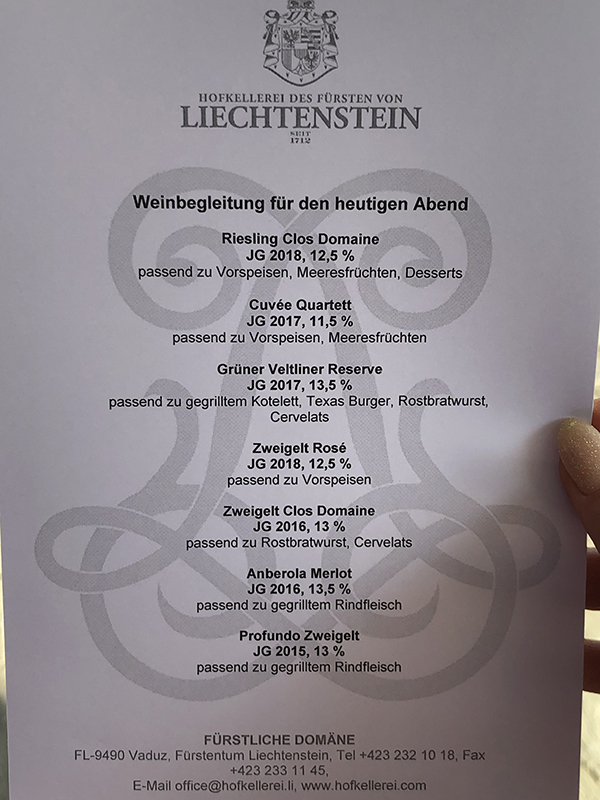 The first day of the trip, we flew into Zurich (Switzerland) from San Francisco on a non-stop flight, rented a car, and drove about 90 minutes to Vaduz. Not only is the Prince’s house in Vaduz, but he also has a winery there, and that evening, we walked from our hotel room to the winery, The Hofkellerei of the Prince of Liechtenstein, to attend an all-you-can-eat grill buffet featuring an all-you-can-drink wine tasting.