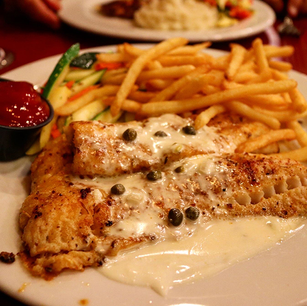 Andy and I shared a crab cake appetizer. I ordered the Pacific Rockfish, and Andy ordered the Blackened Salmon. Our wine selection was a 2017 Hahn Pinot Noir. I should note that there is a “locals” special served daily for $13.95. The special includes a choice of Clam Chowder or Mixed Green Salad. You can also add on a glass of house wine or beer for $3.99.