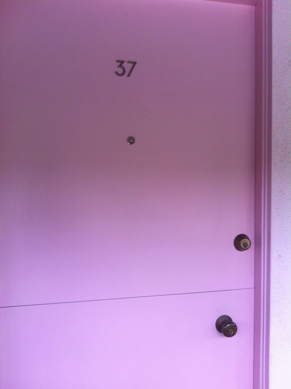 The parking lot even has a wine theme, and the lines to indicate the parking spaces are painted a deep purple inside of white. Here’s Andy’s car parked just outside our room.