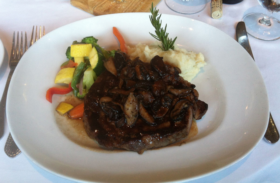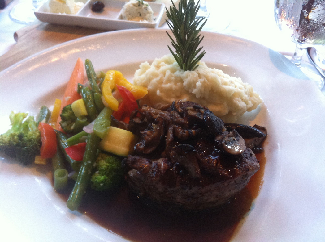 And I ordered the petite filet and shrimp duo (also a regular menu item). It was served with broccoli and scalloped potatoes. The shrimp were cooked in butter, garlic and wine (scampi). The steak was served with green peppercorn, cognac, wine sauce. I usually order a steak rare so that if it is over-cooked by a little it still comes out suitable for me at medium rare, and I don’t have to send it back. This one came exactly as I ordered it, because this is a place that handles meat and seafood with precision.