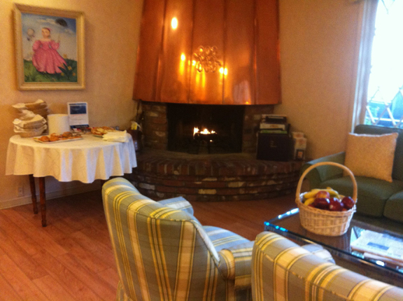 Included with your stay at Hofsas House is a continental breakfast, abundant with fresh French Roast coffee, tea, juice, fruit and pastries from a neighborhood bakery. For those of you like myself who do not eat wheat, there is also fruit available. Most importantly, there is a refrigerator in your room, and you can pack necessary breakfast items. We brought a Tupperware container full of cantaloupe. Below is a picture of the lobby, warm and welcoming.