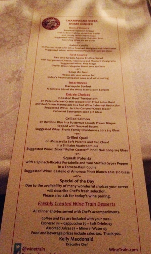 After checking into our room, we had a glass of wine to kick off a romantic evening. I was so excited to return to the Napa Valley Wine Train for dinner, and this time I was able to bring Andy as my guest. I originally wrote about The Wine Train on my other website: cakegrrl.com. You can read the entry by clicking here. 🙂