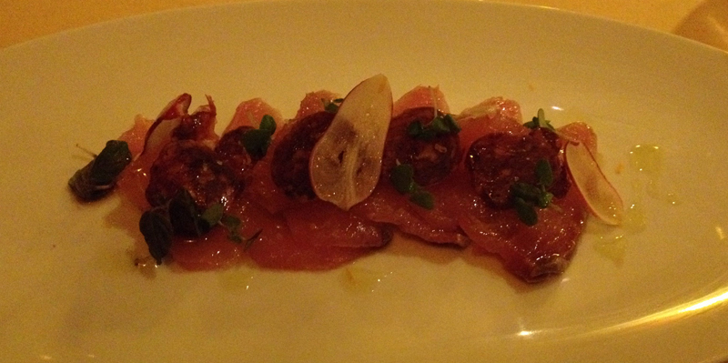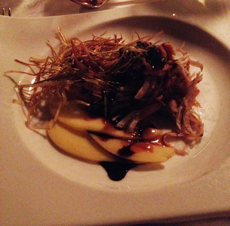 Andy went with the Octopus “Confit” with fingerling potatoes, smoked paprika, extra virgin olive oil and Maldon salt. Since octopus doesn’t have it’s own fat to be a confit, the olive oil was used to slowly cook it, hence the name.